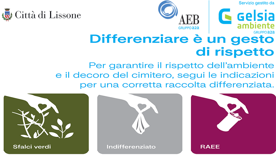 L’ Amministrazione comunale in collaborazione con Gelsia Ambiente - Gruppo a2a , ha provveduto infatti a rinnovare i contenitori di raccolta presenti nell’area cimiteriale, affinché sia possibile procedere ad una raccolta differenziata dei rifiuti ivi prodotti.