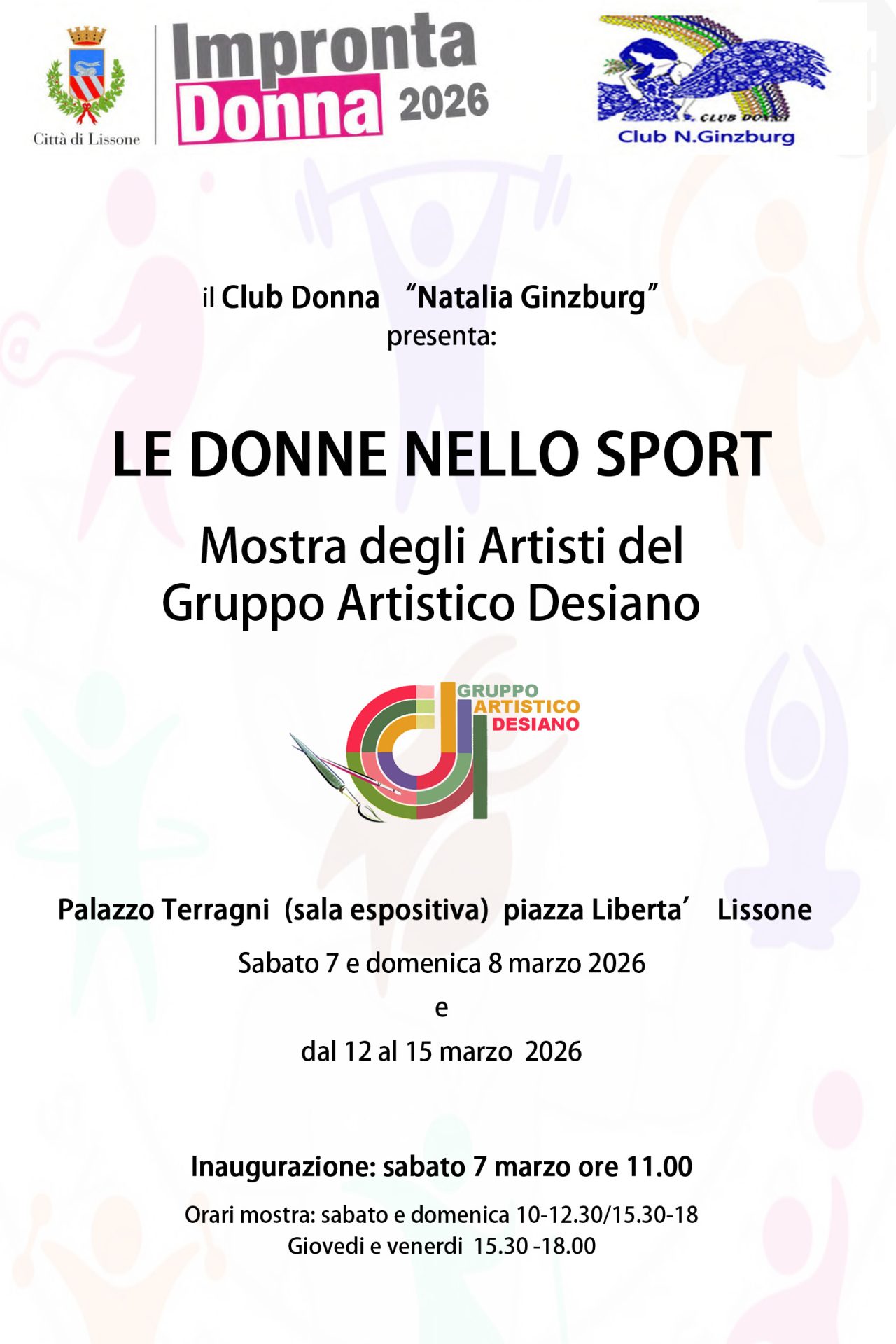 Nell'ambito della Rassegna Impronta Donna 2026, in esposizione nella sala espositiva di Palazzo Terragni le opere realizzate dagli artisti dell'Associazione Gruppo Artistico Desiano sul tema della donna nello sport. La mostra di pittura organizzata con il Gruppo Artistico Desiano è a cura dell'Associazione Club Donna Natalia Ginzburg.